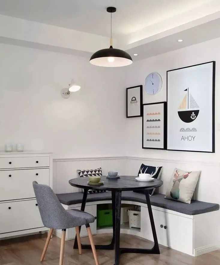 在鸡肋的空间角落打造一个转角卡座,不仅能巧妙改善户型,还能有效收纳,提升家里的整体格调。