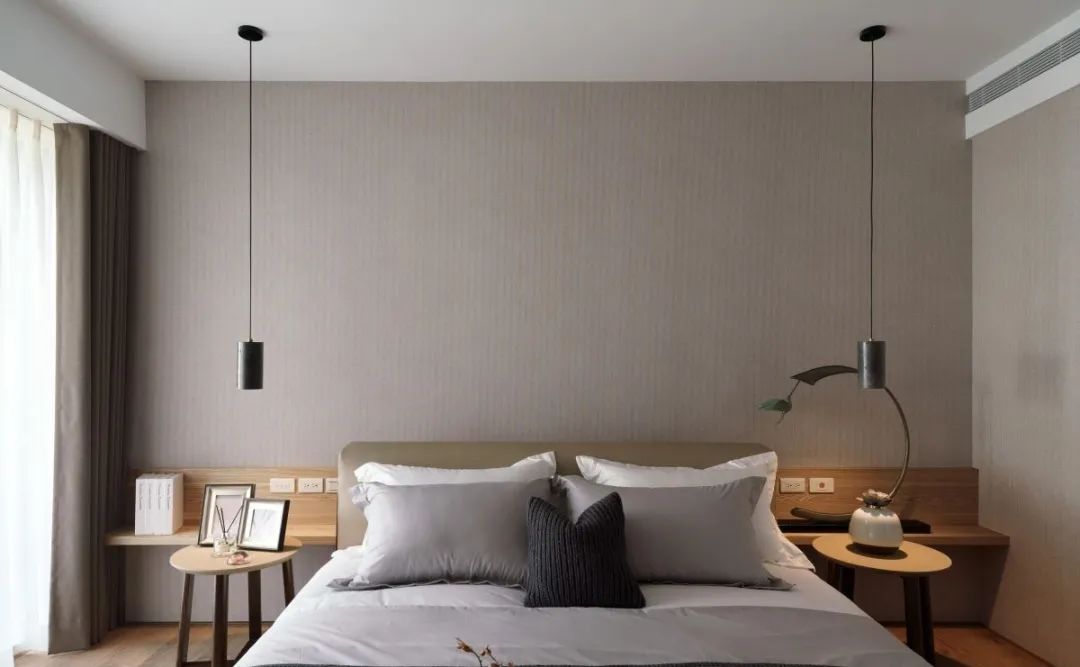 卧室是休息的区域,因此不宜选择过于亮眼的颜色。在材质的选择上,纤维布材质的墙纸不仅吸音,环保性也不错,用在卧室墙面中点缀更显高级。